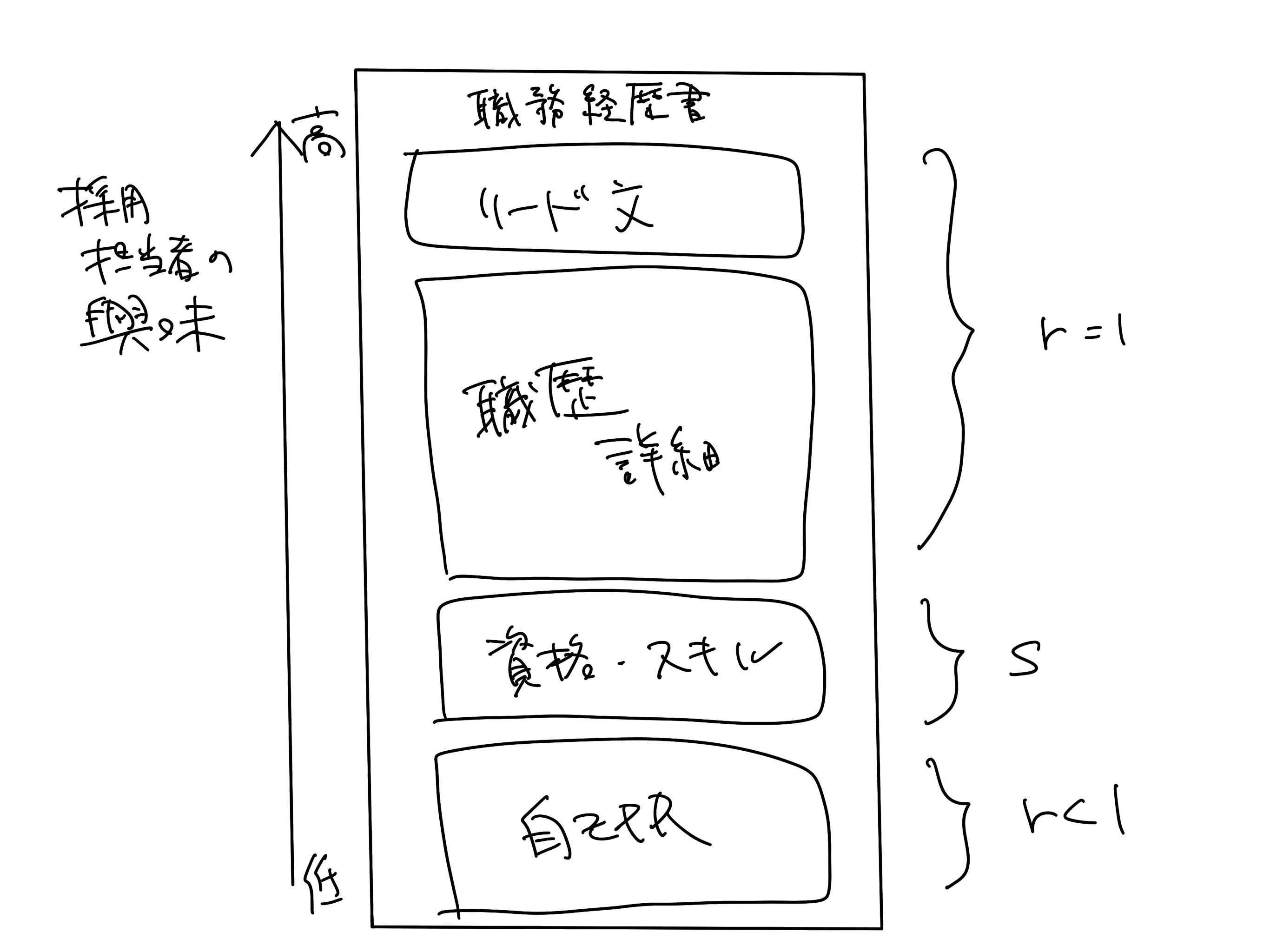 つまり「スキル単体では弱く、本業の業務として行って得た経験こそが市場価値を押し上げる」ということ。そして、これらの関係式は、実際に採用担当者が目を通す職務経歴書の構造とも一致しています。
