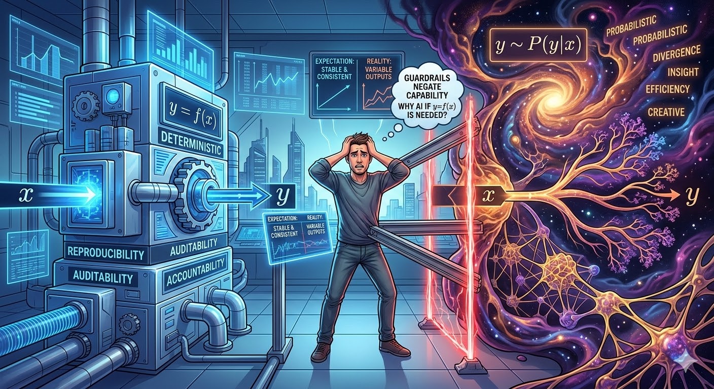 このジレンマをイラストにするとこんな感じ。Nanobananaに作ってもらったこのコンセプトアートも、同一のプロンプトで同一の結果は得られないためnon-deterministic